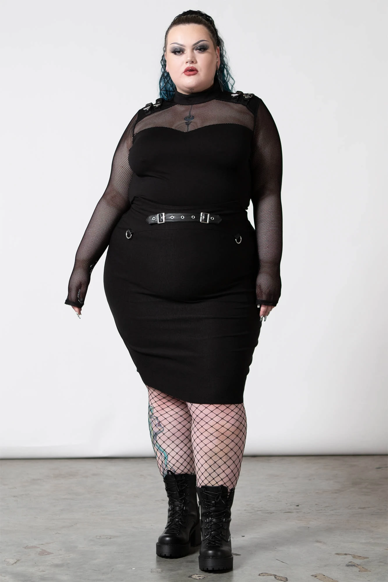 Turn heads in our ‘Arch Enemies’ fishnet top; conjured from a stretch mesh material for a comfortable fit! Featuring a high neck, silver hardware on shoulders and long mesh sleeves. This is the perfect top for adding some extra darkness to any outfit.