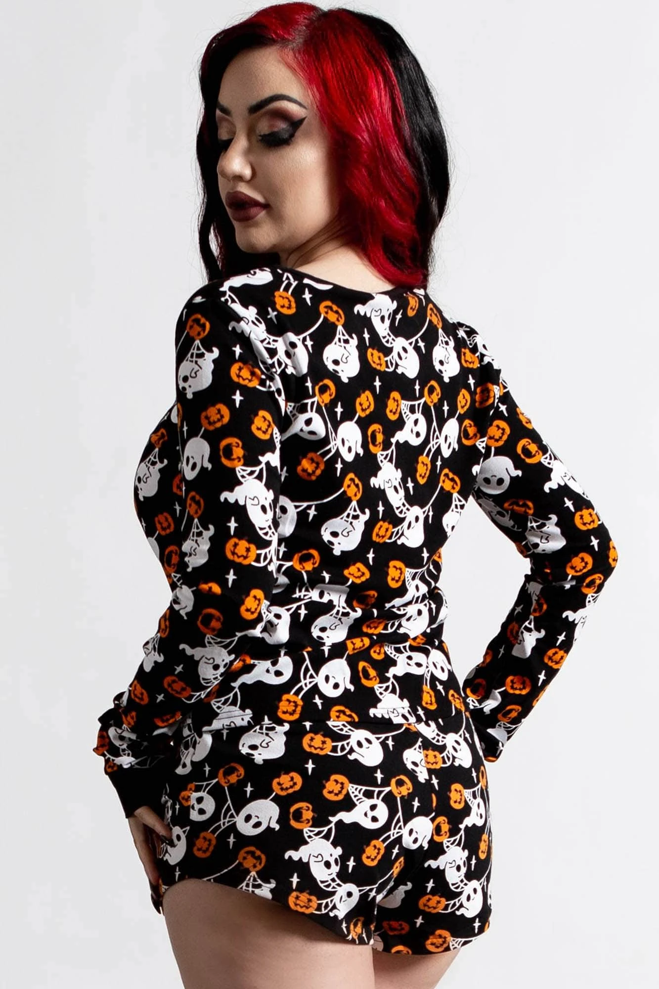 Get down and cozy with the ‘Haunted Pumpkin’ long sleeve top; featuring a fitted body with a round neck in a super-soft cotton-blend with just the right amount of stretch – for perfect comfort and fit! Contrasting print all over, ribbed cuffs and easy to wear from dusk to dawn.