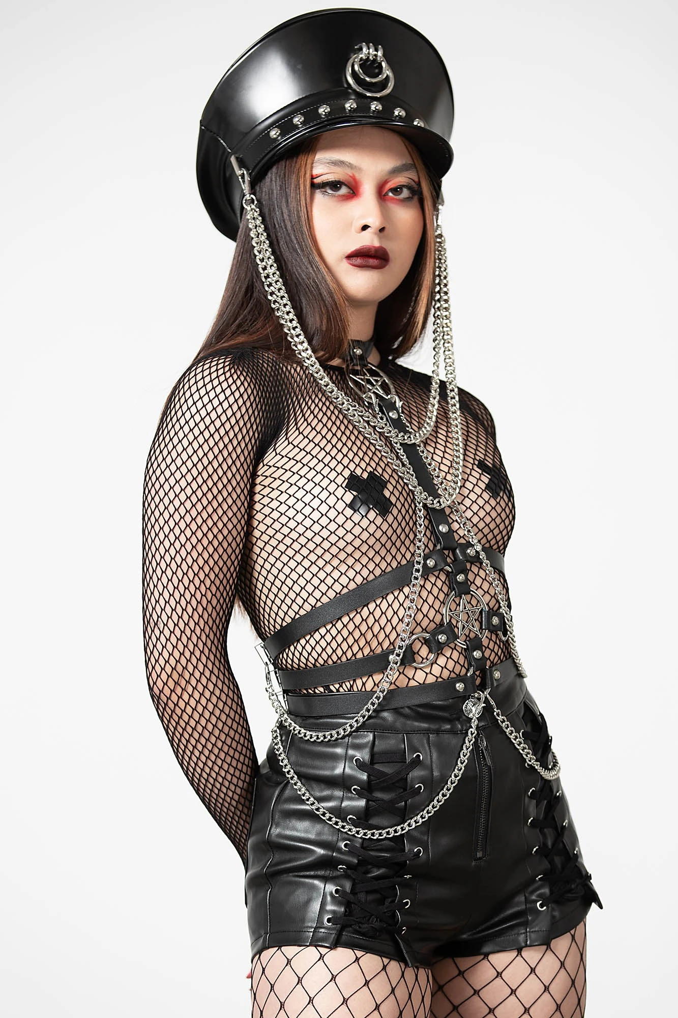 Is my soul too dark for you? Our ‘Hellz Bells’ harness features faux-leather straps with contrasting hardware, pentagram detail, and detachable chains. Adjustable size. Add some serious attitude to any outfit!