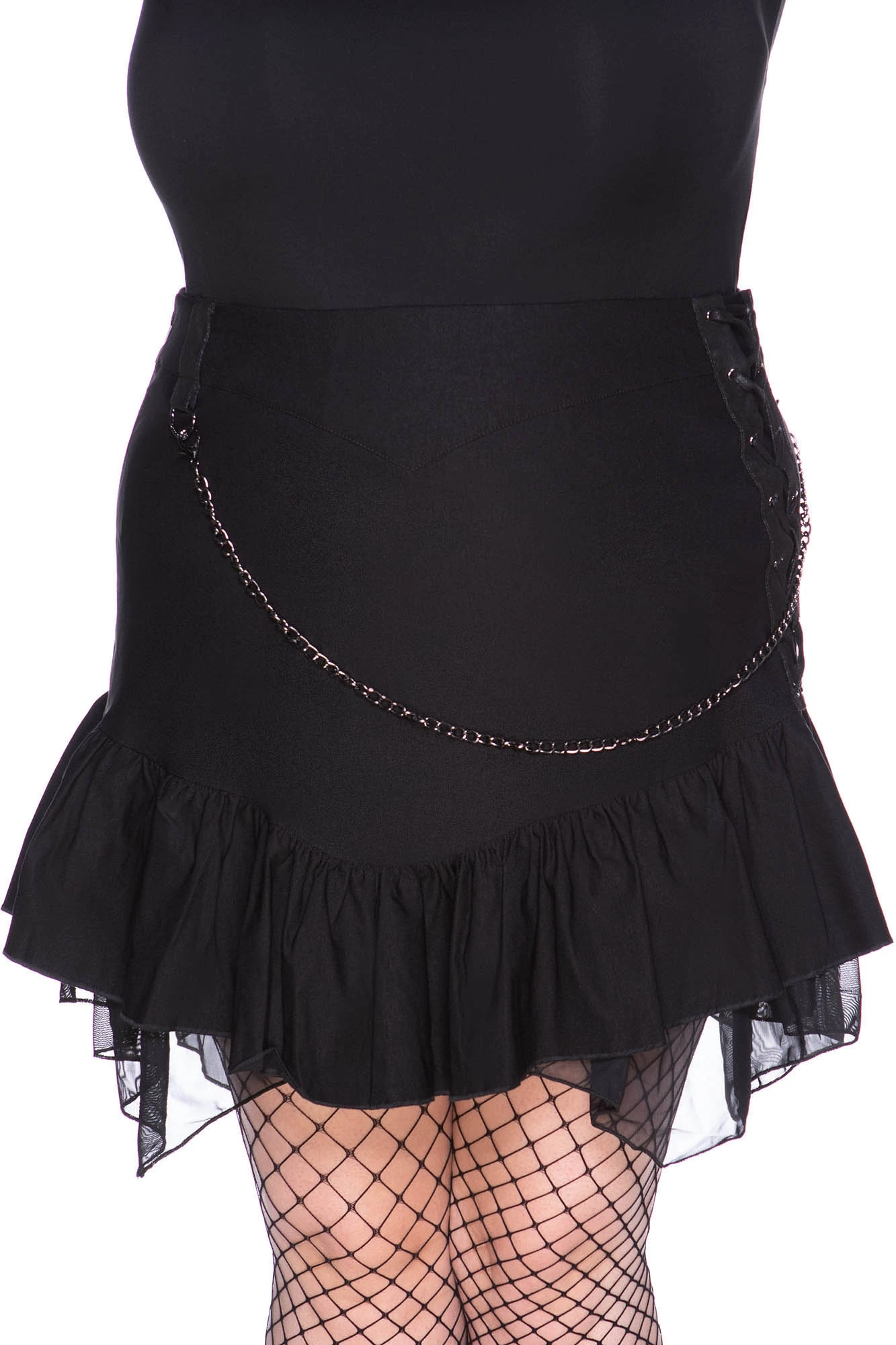 Join me on the adventures into the dark; the ‘Moonspell’ mini skirt is everything you need to swoon. Featuring a super soft fabric body with a mesh panel for a flattering fit combined with superior comfort. With lace-up details on the side, chain and hanky hem. Easy to style and oh-so-versatile – perfect from dusk to dawn.