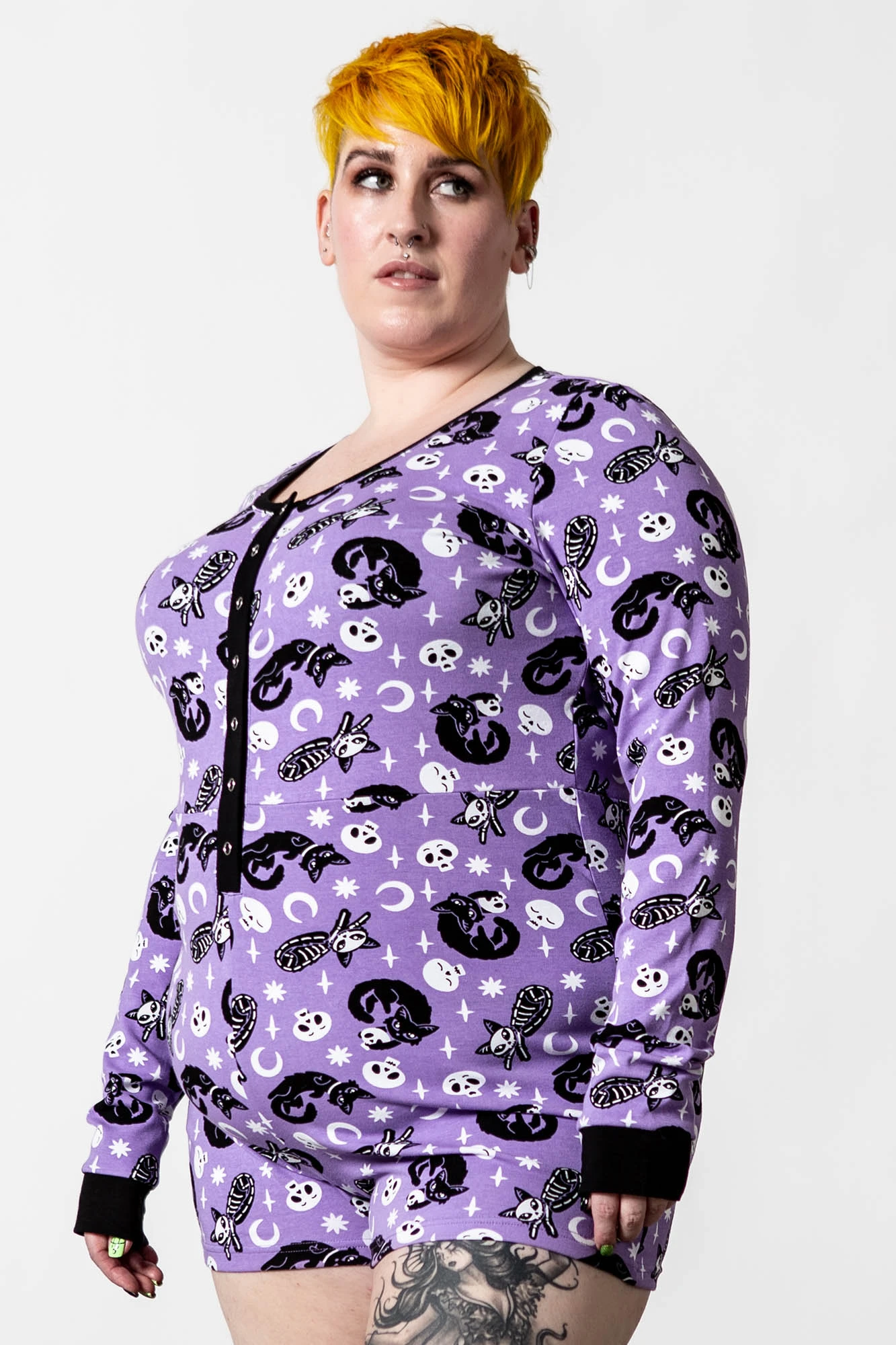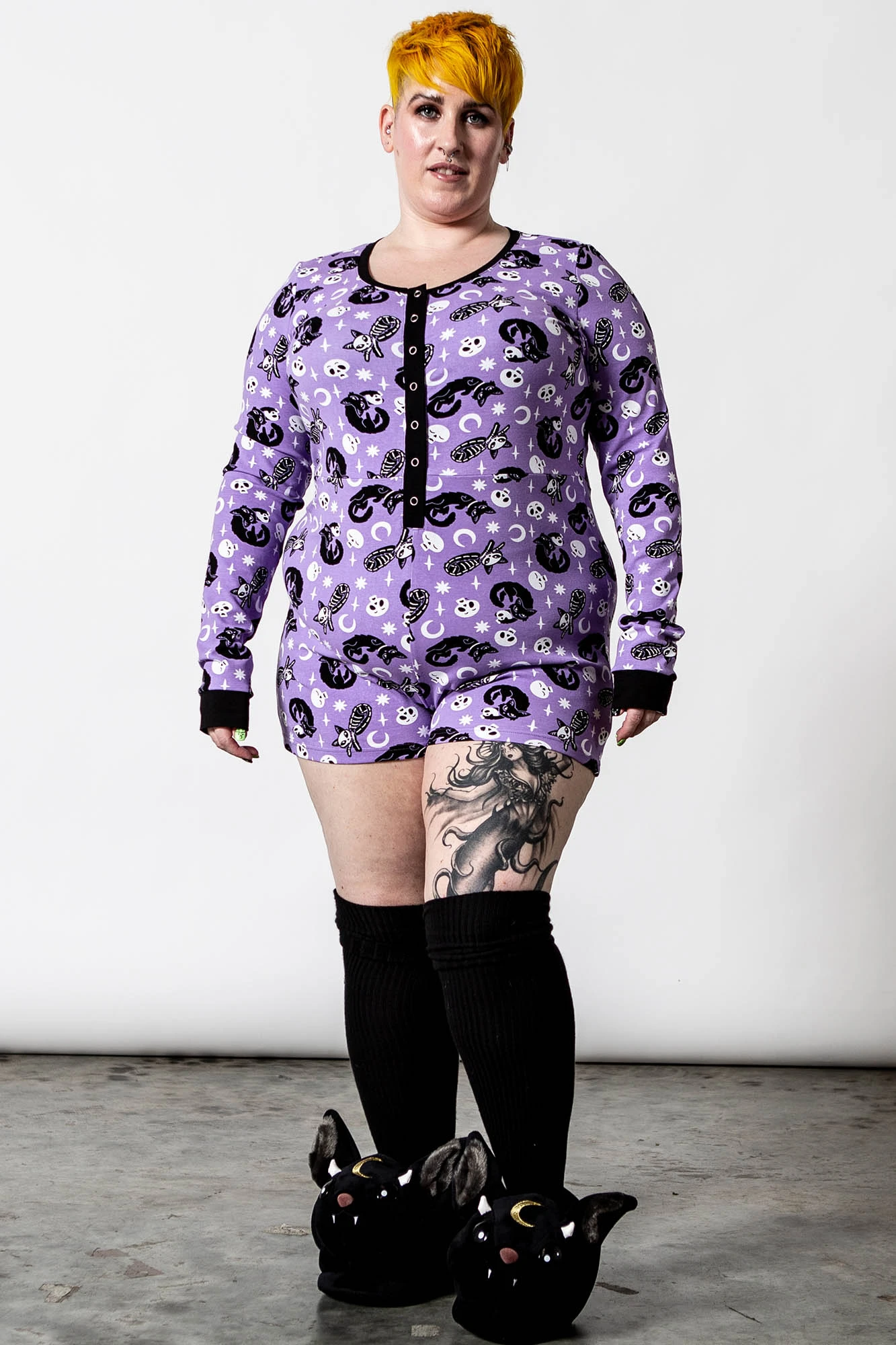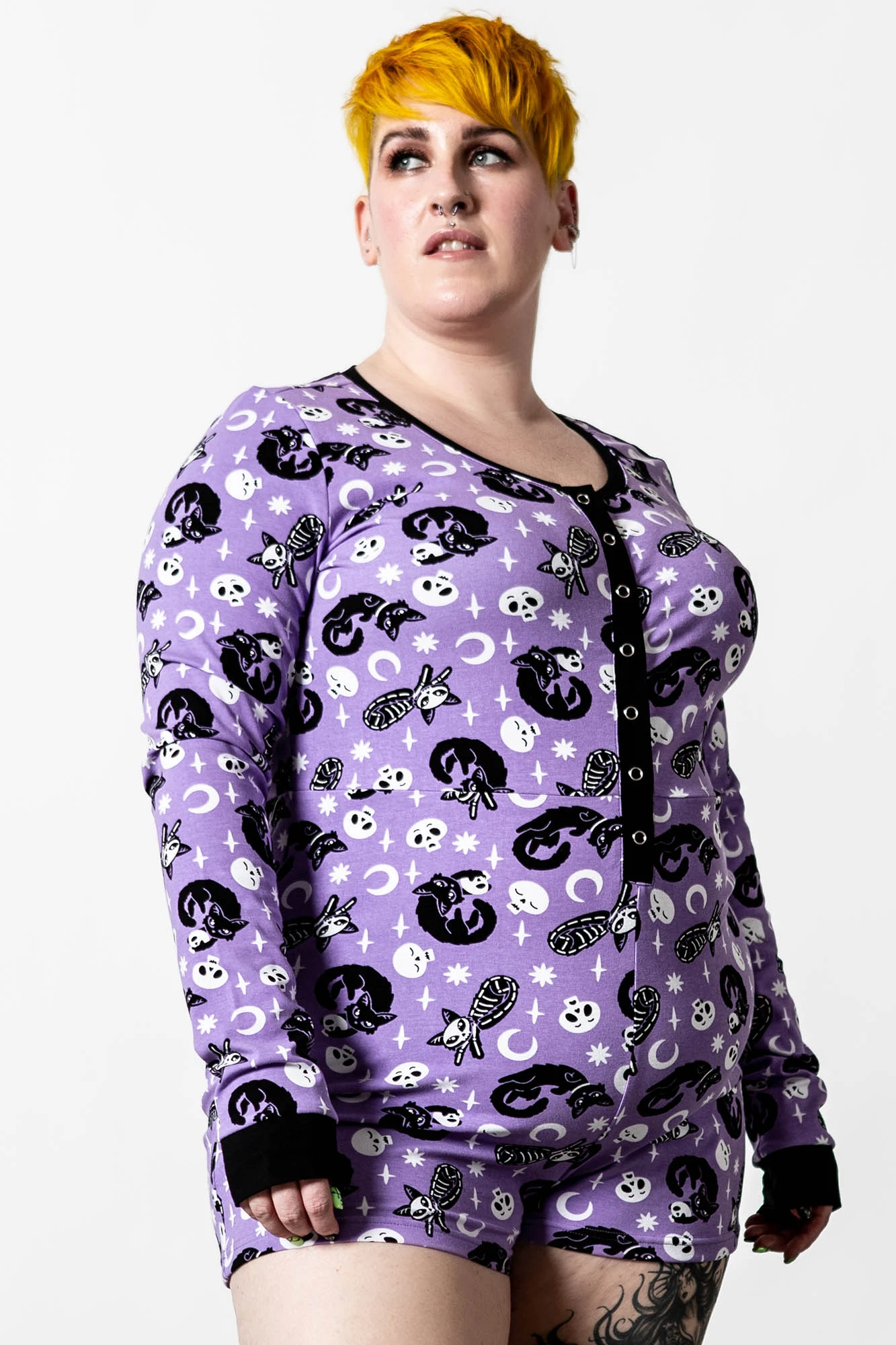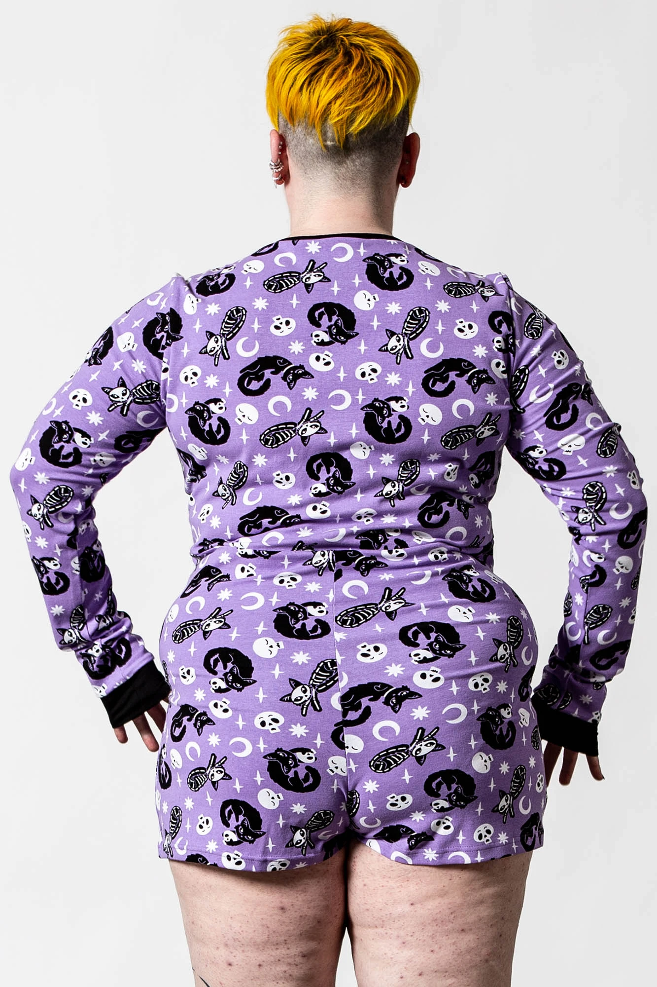 I’m so good at sleeping I can do it with my eyes closed! Rest easy in our ‘Purr Off’ playsuit. Made from a super soft material with just the right amount of stretch! Featuring long sleeves with contrasting cuffs, bold repeat print all over, button-up front and scoop neck – the perfect fit for a movie marathon.