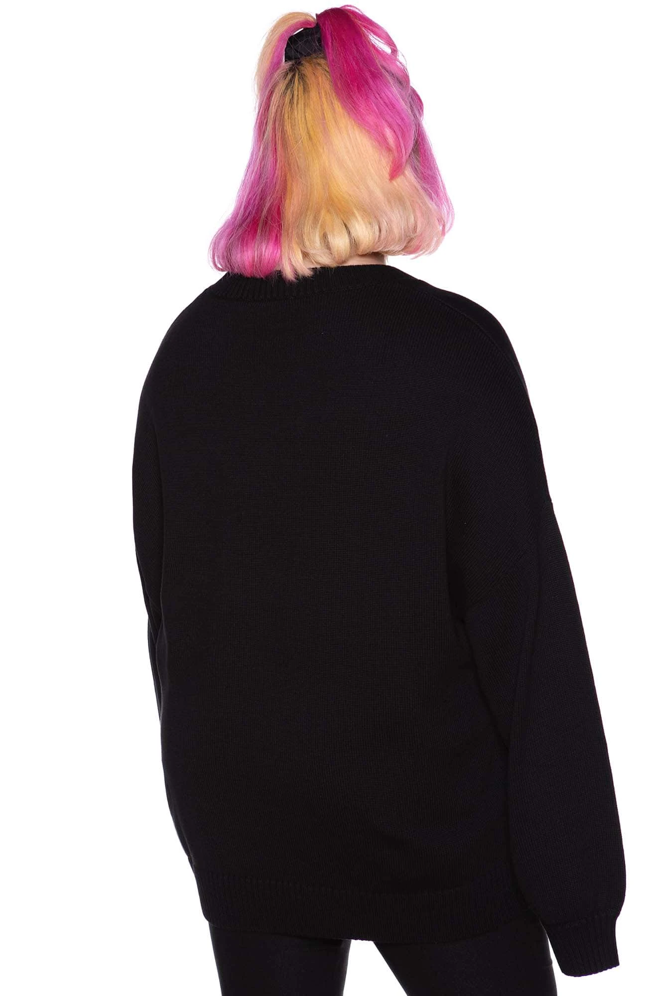 Cozy never looked so good – the ‘Selena’ knit sweater ticks all the boxes. Extra long length to easily be dressed up or down, with a round neck, and contrast crescent moon detail. Dress up or down as you dark heart desires; works both for warmer or colder looks!