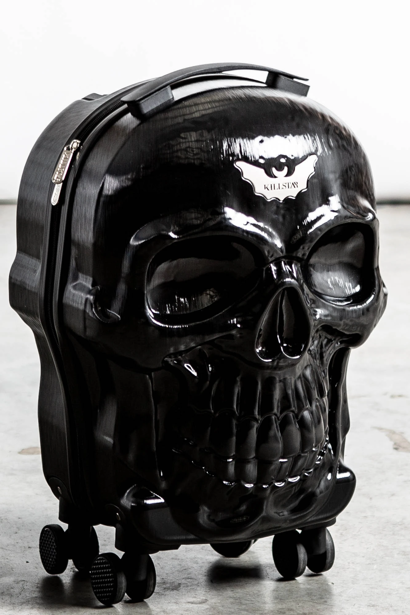 Bring a bit of magic on yer adventures out the crypt. Our ‘Tomb’ travel suitcase will sure cause a stir on your trips to Transylvania. Hard protective case in a custom skull mold, collapsible handle and four wheels so you can be on a constant roll. All black like your soul! With zip closure, multi compartments and just the right size for your carry-on.
