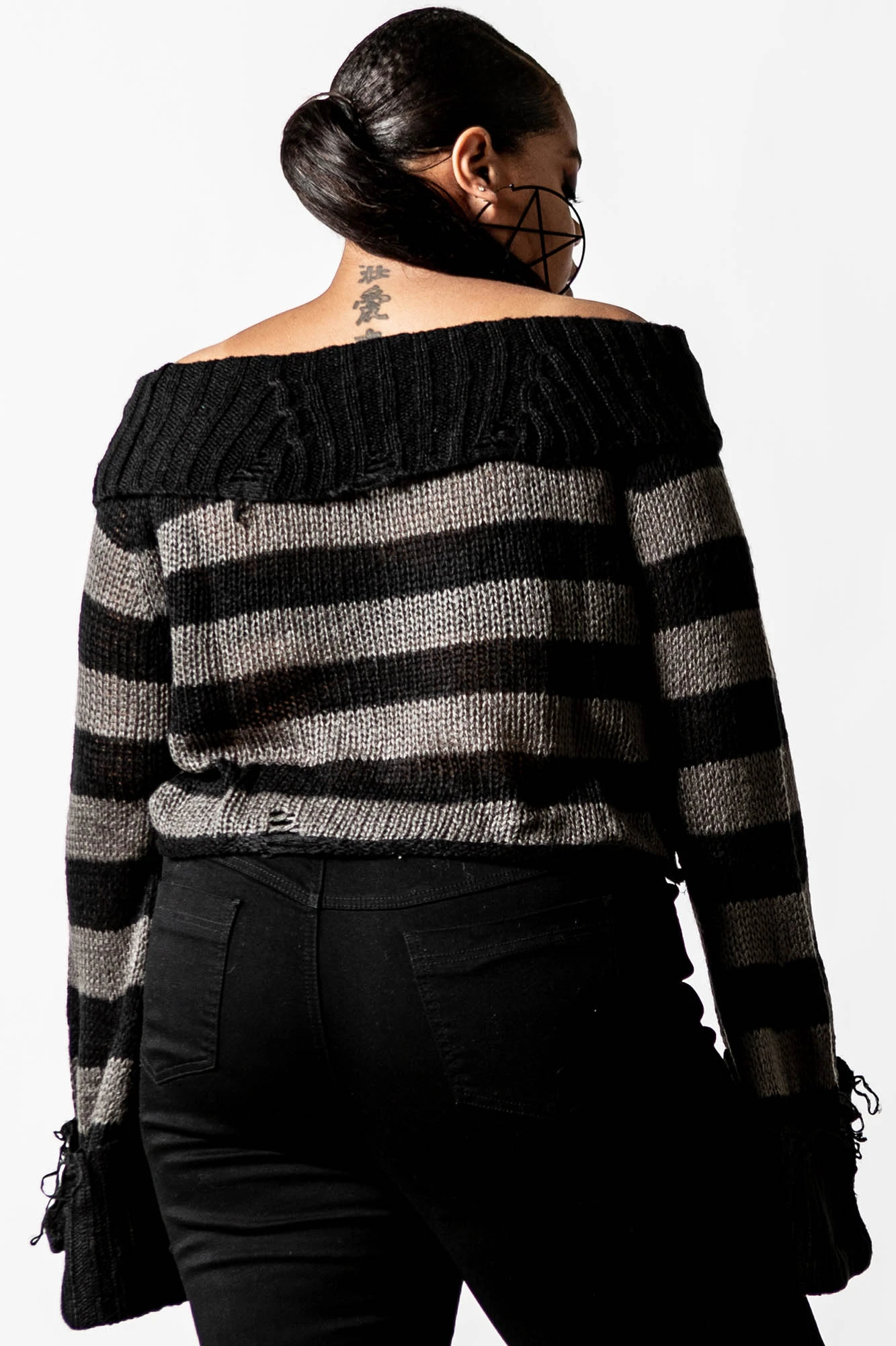 Look cute as hell in the ‘Visage’ knit sweater; conjured using a super-soft fabric for a flattering yet comfortable fit. Features a bardot neckline, statement contrasting stripes and crop style – no detail has been spared! This creepy lil staple piece is a dream to style and looks great with all your fav lookz! Purrrfect for a day out with yer Coven or picnics by the moon!